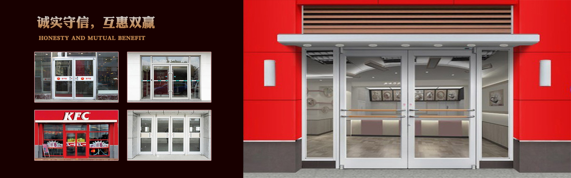 肯德基门以它丰富多样的颜色,新颖时尚的外观,结实耐用,隔热保温,密封性好的性能被人们认同和喜爱。被应用于中西餐厅、酒楼、写字楼、商厂、银行、便利超市等。其匠心的设计,新颖的现代欧式化造型,美观实用为客户带来生活享受及的保证。